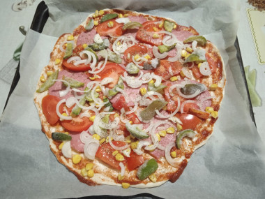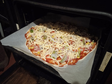 Как же мы любим вкусную домашнюю пиццу. Увидела рецепт "пицца с салями и сыром моцарелла" и взяла его за основу. Приготовила тесто по описанию в рецепте и оставила на час в теплом месте. Маслины не клала, так как мы их не любим, вместо них добавила немного зёрен кукурузы. Сыр моцарелла заменила твердым сыром голландским. Взяла салями, болгарский перец и ещё лук от себя добавила. Соус приготовила на основе томатной пасты с добавлением итальянских трав и мускатного ореха, это невероятно ароматно вышло. Раскатала тесто тонко, смазала соусом, разложила начинку и ещё сверху посыпала итальянскими травами. Присыпала тёртым сыром и выпекала в духовке 15 минут. Волшебная пицца в миг разлетелась со стола, еле успела сфоткать) потрясающе вкусная и ароматная! Самая вкусная пицца свежеприготовленная, поэтому готовлю непосредственно перед подачей. Начинка отличная даже без маслин, очень сытно получилось. Перец болгарский придаёт изюминки, а помидоры - сочности, салями естественно - пикантного вкуса. А вот тесто непревзойдённое. Оно такое вкусное, и мягкое, и хрустящее. Обалдеть просто! Очень и очень нам понравилась пицца по этому рецепту, буду ещё так готовить и всем советую. Огромное спасибо автору 😊