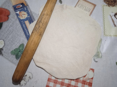 Поднявшееся дрожжевое тесто распределите по форме для пиццы. Диаметр моей формы 30 см. Тесто очень мягкое, податливое и легко распределяется руками по всей форме. Смазывать форму ничем не нужно. Если хотите, чтобы пицца получилась на толстом тесте, оставьте тесто на 10-15 минут, чтобы оно немного поднялось.