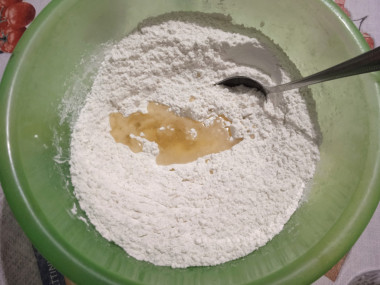 Влейте в мучную смесь теплую воду, нагретую до 37-40°С и растительное масло.
