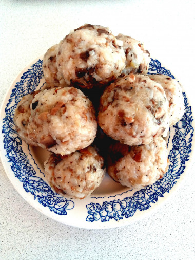 3. Смешайте рис с обжаренными овощами и грибами. При желании можно добавить в тефтели зелень. Сформируйте тефтели и выложите их в форму для духовки.