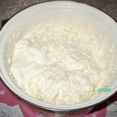 5. Размягченное сливочное масло взбейте в пышную массу. Продолжая взбивать с небольшой скоростью, по ложке введите мучную массу, каждый раз хорошо перемешивая. Так смешайте весь крем.