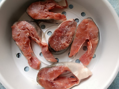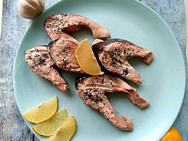 Как сделать горбушу на пару? Подготовьте продукты. Не обязательно брать именно охлажденное филе горбуши, - можно использовать и стейки рыбы. Также горбушу можно заменить на другой вид рыбы, но калорийность и время приготовления блюда в таком случае изменятся. Если вы готовите из замороженной рыбы, то ее нужно предварительно разморозить. О том как правильно разморозить рыбу читайте в статье по ссылке в конце рецепта.