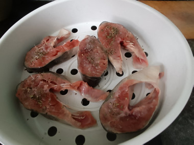 Выложите в корзину-вставку кусочки рыбы кожей вниз. Поперчите ее по своему вкусу. Также на этом этапе вы можете добавить свои любимые травы или приправы в свежем или сушеном виде, например, тимьян, розмарин, прованские травы или сухой чеснок. Время приготовления зависит от вида рыбы, а также от толщины и размера кусочков. Среднее время приготовления около 25 минут, готовая рыбка легко разбирается на волокна.
