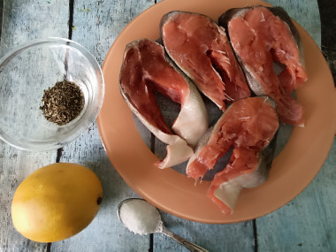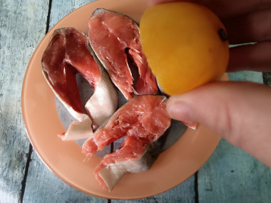 Горбушу хорошо промойте, промокните бумажными салфетками, чтобы рыба не получилась водянистой. При необходимости разрежьте на куски желаемого размера.