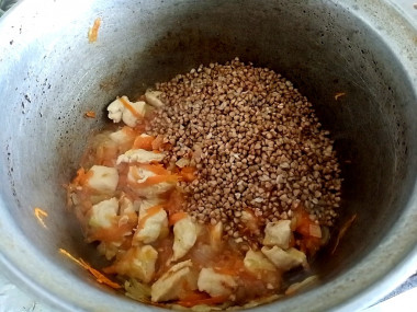 Немного потушив курицу с овощами, добавила в кастрюлю гречку и, помешивая, обжаривала ее пару минут, чтобы крупа пропиталась зажаркой. Затем добавила воды, посолила и закрыла крышку. Когда вода закипела, не открывая крышку, уменьшила огонь и около получаса гречка томилась на минимальном огне.