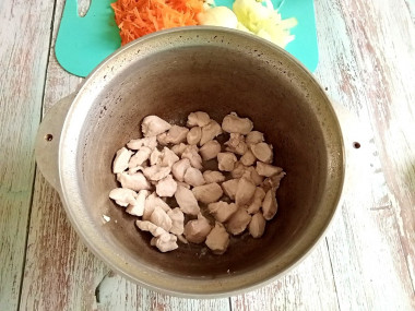 Пока курица обжаривается, нарежьте лук, а морковь натрите на крупной терке. Если любите, чтобы морковь ощущалась, то можете ее просто мелко порезать ножом.
