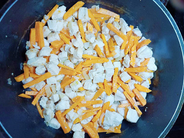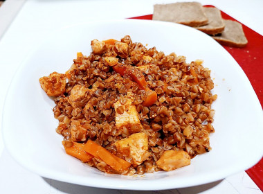 В этот раз для гречки по-купечески использовала куриное филе и ничуть не пожалела. Обжарила на подсолнечном масле лук, затем добавила порезанное на кусочки филе, когда курица приобрела золотистый цвет, бросила морковь и через пару минут добавила томатную пасту.
