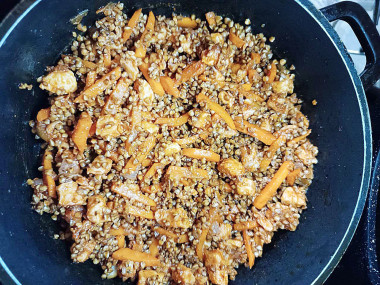 Готовила я в казанке, т. к. сковорода была занята. У меня была куриная грудка. Обычно она получается суховатой, но в этот раз мясо вышло сочным и мягким. Сначала кусочки курицы я обжарила в растительном масле до побеления, затем добавила лук кубиками и морковь, натертую на крупной тёрке. После обжарки добавила пол стакана воды и потушила минут 15. А дальше уже заложила промытую гречку, залила горячей водой и томила на медленном огне пока на дне не осталось немного воды. Остаток жидкости потом впитался в гречку сам). Специи не добавляла, только соль.