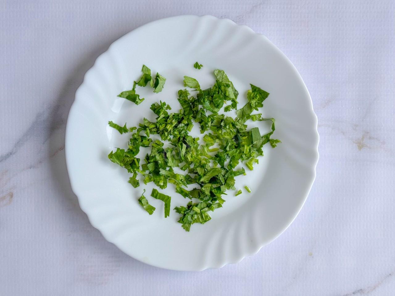 Зелень помойте, обсушите бумажными полотенцами и мелко порубите. Я использовала кинзу, но подойдет любая другая зелень по вкусу.