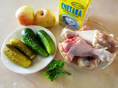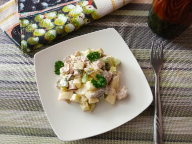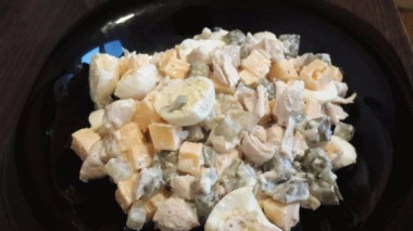 Сделала салат Париж на скорую руку. Вместо куриного филе нарезала отварное мясо от окорочков. Маринованные и свежие огурцы, яблоко ( очищенное от кожуры) также нарезала кубиками, добавила немного зелени петрушки, заправила сметаной - салат готов! Быстро и просто! Добавление маринованного огурчика прекрасно дополняет вкус остальных ингредиентов салата. Получилось интересное сочетание, нам понравилось))). Спасибо автору за рецепт!