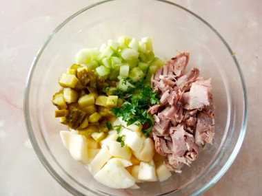 Как сделать Салат Париж на скорую руку? Отварите куриное филе, остудите и нарежьте все ингредиенты крупным кубиком.