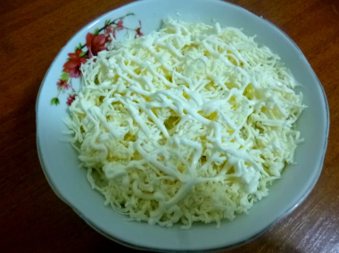Сыр Косичка извлеките из упаковки и возьмите нужное количество для салата. Разберите сыр на волокна или порежьте соломкой. Добавьте следующим слоем в салат и промажьте майонезом. Степень нарезки варьируйте под себя. То есть она может быть разной, под индивидуальные предпочтения.