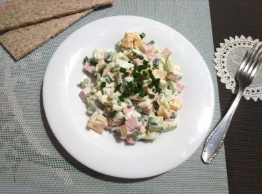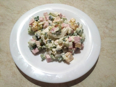 Салат из пекинской капусты с копчёной курицей взяла за основу и приготовила великолепный ужин, заменив два ингредиента. Вместо копченой курицы взяла варёную колбаску по своим соображениям, а солёные огурцы заменила сезонными свежими. Сыр для салата выбрала голландский, а майонез использовала 30 %. Готовила салат в большой салатнице, а подавала порционно. Старалась нарезать все продукты кубиками одинакового размера по рекомендации автора. Смешала все ингредиенты, заправила и посолила. Великолепный салат и вполне самодостаточный, подавала как отдельное блюдо на ужин. На приготовление не ушло много времени, а блюдо вышло сытным и очень аппетитным. Спасибо большое!