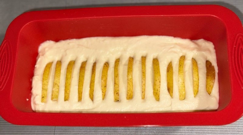 Выложите нарезанные груши сверху пирога, слегка утопив их в тесте. Способ укладки может быть любой, выбирайте сами.Шаг 11: