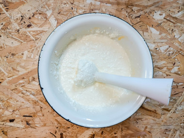 Взбейте массу до однородности. Она должна получиться текучей и слегка вязкой, без комков творога. Вместо стационарного блендера можете использовать погружной.
