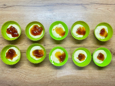 Дальше добавьте чайную ложку варенья в тесто, которое уже в формах.