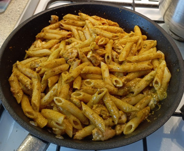 Откиньте готовые макароны на дуршлаг, а затем, когда стечет вода, выложите их на сковороду к готовой курице. Сразу же добавьте к пасте соус песто и вяленые помидоры. Перемешайте, подержите блюдо еще пару минут на огне.