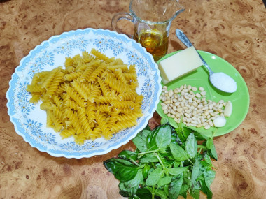 Как сделать макароны с соусом песто и сыром? Подготовьте продукты. Макароны возьмите любой формы, у меня спиральки, хорошо подойдут спагетти или перья. Выбирайте пасту, сделанную из сортов твердой пшеницы — они вкуснее и полезнее. Базилик для песто подходит только зеленый, к нему еще можно добавить петрушку. Орехи в классическом рецепте используются кедровые, но можно заменить их на кешью или грецкие.