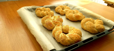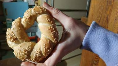 невероятно сложно. Но желание не отступало, тем более, что в наличии имелся пакетик кунжута, который я очень люблю. Не долго думая, принялась за тесто. Сразу скажу, что делала рецепт на 6 порций. Муки у меня ушло меньше, чем в рецепте - 215 граммов. Автор предупреждал об этом - тесто нужно почувствовать. Тесто разделила на 3 части. Хотела на 6, но бублики были бы очень маленькие. Работать с тестом оказалось одно удовольствие. Оно мягкое и податливое. Все делала в точности как в рецепте. Тесто легко раскаталось "в веревочку", я сделала из него жгутики и сформировала бублики. Правда, они начали немного раскручиваться, но я с этим справилась. Немного переживала из-за того, что бублики нужно было поставить в духовку на 35 градусов, а в моей духовке минимальная температура - 50 градусов. Поэтому я нагрела духовку до 50 градусов, а потом приоткрыла дверцу, чтобы температура упала. Пекла при 250 градусах 10 минут. Какие же красивые они получились! А какие вкусные!!! В следующий раз испеку побольше и обязательно удивлю гостей!