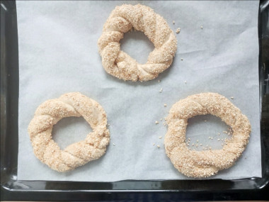 Окуните каждый симит сначала в воду (в сироп), а затем обваляйте в кунжуте. Выложите симиты на противень и поставьте примерно на 15 минут в духовку, разогретую до 35 градусов. Затем достаньте и дайте постоять еще минут 15. Симиты хорошо подойдут. В это время разогрейте духовку до 220-250 градусов (или на сколько она у вас способна). Испеките турецкие бублики до золотистой корочки. На это уйдёт примерно 7-9 минут. Точное время будет зависеть от особенностей вашей духовки. Узнать об особенностях работы духовок можно, прочитав отдельную статью, ссылка в конце рецепта.