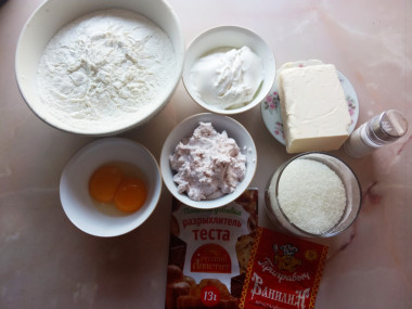 Как испечь печенье из творога и сметаны? Подготовьте все необходимые ингредиенты. Все тонкости приготовления песочного теста читайте в отдельной статье, ссылку на нее вы найдете в конце рецепта.
