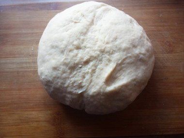 Замесите тесто. Помните, что муки может понадобиться чуть меньше или больше, ориентируйтесь на консистенцию теста. У меня творог был слегка жидкий поэтому муки ушло чуть больше. Вот такой колобок получился. Тесто плотное, не липнет к рукам. Заверните его в пленку и уберите в холодильник на час.