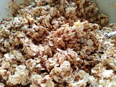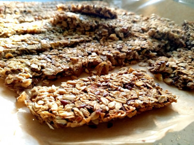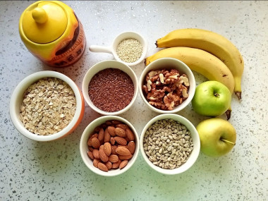 Недавно запекала подобные батончики для мужа, попросил ещё сделать. Нашла на сайте рецепт энергетического батончика домашнего. Здесь процесс немного другой, нужно превратить в пюре банан и яблоко. Я это делала при помощи блендера. Бананов взяла два небольших, яблок тоже, т к. по предыдущему опыту знаю, что овсянка впитывает много жидкости. Мед добавила в пюре, чтобы лучше распределился. От себя ещё пару ложек масла влила в эту смесь для золотистого цвета. Из наполнителей у меня были льняные и подсолнечные семена, грецкие орехи, миндаль и кунжут. При вымешивании смесь стала влажной, но я бы еще добавила пюре для связки. По противню распределила смесь ложкой, а потом придавила разделочной доской. Выпекала как и указано в рецепте 20 минут при 180°. Пласт нарезала после остывания. Срезы немного крошатся, но это не страшно) Батончики внутри немного тягучие, а снаружи хрустящие. Очень вкусные, особенно с кефиром или йогуртом, хорошо чувствуется банан. А главное они полезные, настоящий суперфуд!