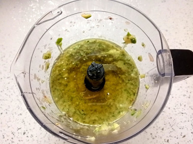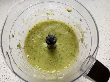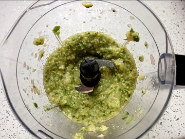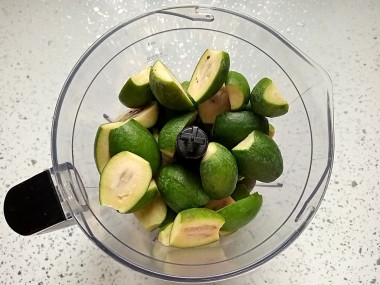 Плоды выбирала целые, не порченые, однородного зеленого цвета. Помыла, обсушила и разрезала на части. В чистом виде у меня вышло 600 г. Измельчила в блендере. Раньше использовала мясорубку, но блендер больше понравился. Мед взяла цветочный жидкий. После повторного взбивания масса стала светлее. Вообще советую все делать быстро, внутренняя часть фейхоа может потемнеть от контакта с воздухом.