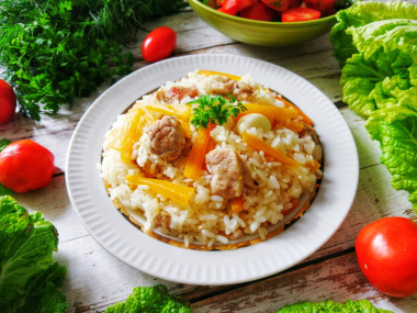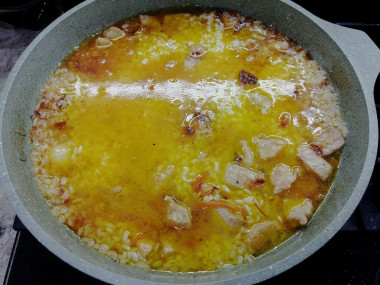 Кусочки свинины потушила под закрытой крышкой 30 минут, затем крышку открыла и обжарила свинину до румяной корочки. Далее всё по рецепту, единственное- рис у меня был готов уже через 15 минут (через 50 минут, как указано в рецепте, была бы каша, сорт риса такой).