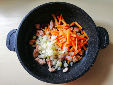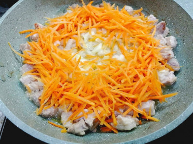 Решила сделать на обед плов и остановилась на рецепте рассыпчатый плов со свининой в сковороде. Небольшой кусок свинины разрезала на кусочки. Включив сильный огонь, обжарила мясо на растительном масле до румяной корочки. Добавила нарезанные лук и морковь, держала на сковороде вместе с мясом 3 минуты. Затем влила немного горячей воды, посолила, закрыла сковородку крышкой и оставила на маленьком огне на 20 минут.