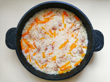 Добавьте в сковороду пропаренный кипятком рис (см. шаг 2) и залейте всё водой, чтобы она полностью покрывала рис. Перемешайте и накройте крышкой. Готовьте плов минут 30 на медленном огне. Во время готовки перемешивать не надо.