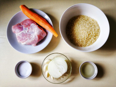 Как сделать рассыпчатый плов со свининой в сковороде? Подготовьте для этого все необходимые ингредиенты. Лук и морковь очистите от кожуры и ополосните в проточной воде от загрязнений. Свинину я беру с небольшим количеством сала. Сало не дает мясу пересушиться.
