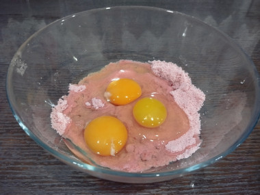 Кисель у меня был плодово-ягодный,который я размяла руками. Вместо соды использовала разрыхлитель. Добавила остальные ингредиенты, перемешала, выложила в форму и выпекала при 180° 30 минут.