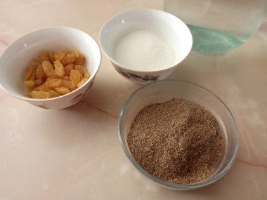 В трехлитровую банку всыпать сухой квас, сахар (по желанию). Аккуратно в середину банки влить кипяток (если лить на стенки, то банка может лопнуть от перепада температур) и перемешать до полного растворения сахара. Когда смесь остынет до комнатной температуры, всыпать немытый изюм (так же, по желанию). Изюм мыть нельзя, потому что на нем есть необходимые дрожжевые грибки, которые запускают процесс брожения.