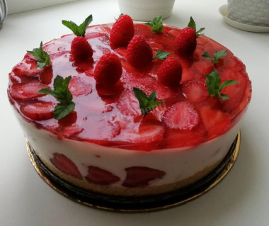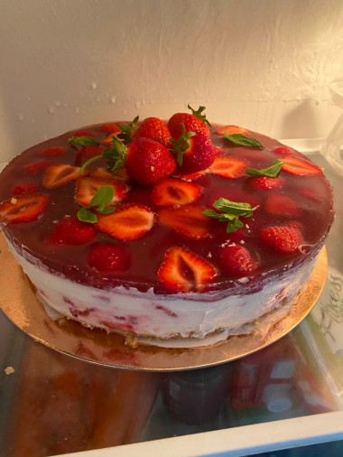 Мои замечания к рецепту - у меня ушло немного больше клубники, около 600 грамм, но это потому что я выкладывала половинки клубники по ободку формы. Хочу поделится как я сделала клубничный сок - у меня была замороженная домашняя клубника протертая с сахаром, я залила ее кипятком, дала настоятся 15 минут и процедила через сито, получился очень ароматный и натуральный сок. Что касается самого чизкейка - это очень вкусно, невозможно описать словами - нужно пробовать! У нас он очень быстро исчез из холодильника.