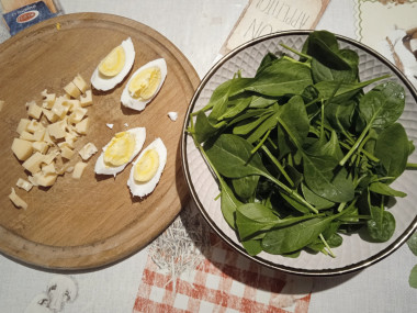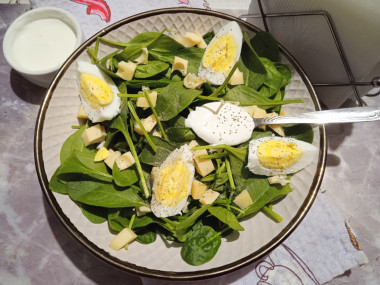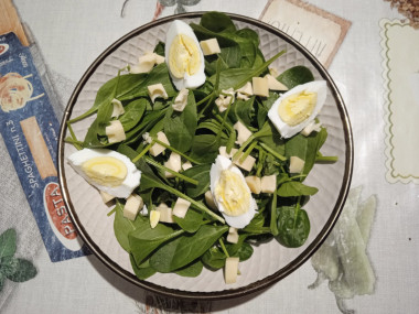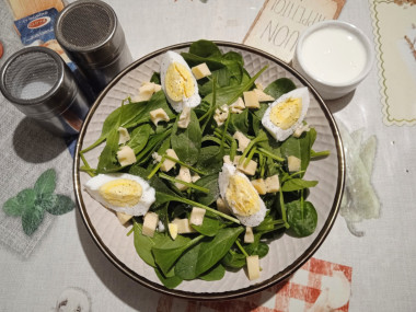 Сделала салат со шпинатом свежим и сыром с яйцом на лёгкий ужин по этому рецепту. Взяла свежий шпинат, вымыла и просушила. Отварила домашние яйца вкрутую. Сыр использовала твердый радомер. Сметана была у меня 15% жирности. Готовить этот салат считанные минут, нужно только яйца заранее сварить. Выложила на блюдо свежий шпинат. Добавила кубики сыра и дольки вареного яйца. Посолила и поперчила про вкусу. Для подачи приготовила сметану. Перед тем как кушать салат уже смешивали. Очень простой и вкусный салатик. Он полезный, витаминный и красиво смотрится на тарелке. Из данного количества продуктов у меня вышло две порции. Салат превосходный, он лёгкий, не калорийный, аппетитный и эффектный. Хороший рецепт! Просто, быстро и оригинально. Большое спасибо автору 😊