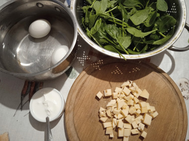 Сыр извлеките из упаковки и порежьте маленькими кубиками, добавьте в тарелку со шпинатом.