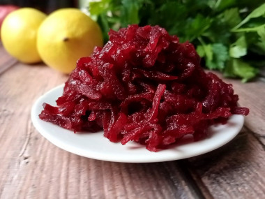 Искала рецепт с участием свеклы, этот овощь зимой наиболее доступен. Нашла салат из свеклы на зиму в банках заготовка. Сделала его "на сейчас", но будет просто замечательно, если баночка такой свеклы будет в запасе. Для ускорения процесса взяла замороженную натертую свеклу. Воды добавила поменьше, лёд растопился и жидкости как раз хватило. Тушила я около часа на маленьком огне. Думала, что все разварится, но свекла получилась даже слегка хрустящей. После добавления уксуса вкус стал намного интереснее. Сахар и соль регулировала на свой вкус. Это отличный салат-закуска на все случаи жизни!