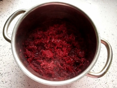 Для тушения возьмите миску или кастрюлю, в которой свободно разместятся все ингредиенты. Я взяла большую кастрюлю. Переложите в нее свеклу и поставьте на средний огонь. Дождитесь, пока овощи дадут сок. Чтобы ускорить процесс можно накрыть крышкой. После закипания тушите в течение 1,5 часов, периодически помешивая. Снимите с плиты и залейте уксус, перемешайте.