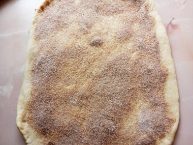 На присыпанной мукой поверхности раскатайте тесто в прямоугольник толщиной 3-5 мм. Сверху смажьте тесто мягким сливочным маслом и равномерно посыпьте сахаром с корицей.