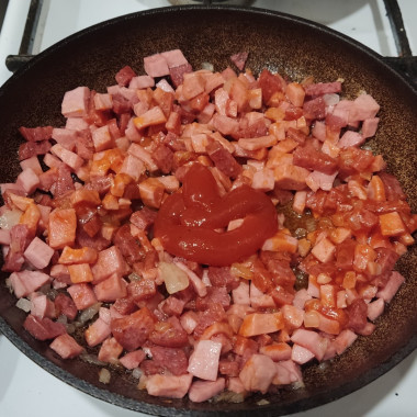 Примерно через 10 минут жарки к колбасе в сковороду добавьте томатную пасту.