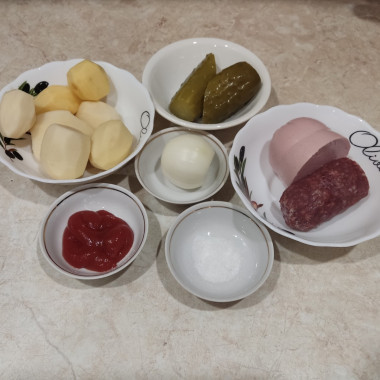 Приготовила вкусное блюдо на первое: простая солянка классическая с колбасой без мяса! Готовится просто и быстро! Картофель порезала средними кубиками, лук мелко порезала, огурцы порезала небольшими кубиками. Колбасу варёную и копчёную также порезала кубиками. Оливки не использовала.Пока варился картофель, обжарила лук. Затем добавила колбаску, томатную пасту, всё вместе обжарила.