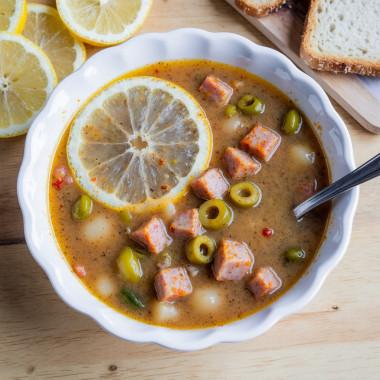 Солянка - традиционный русский суп с ярким кисло-соленым вкусом. Наш вариант с колбасой сохраняет все характерные черты блюда, но готовится быстрее и проще классического мясного варианта.
