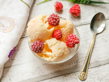 Подавайте мороженое к столу. Я использовала специальную ложку для мороженого, чтобы получились шарики. Одну порцию полила карамелью и посыпала орехами, другую вишневым конфитюром, третью подала с малиной замороженной и сублимированной. Приятного аппетита!