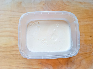 Остудите получившуюся массу до теплого состояния. Затем перелейте ее в подходящий контейнер с крышкой и уберите в морозилку. Чтобы мороженое получилось однородным, без ледяных кристалликов, доставайте его каждые 40 минут и перемешивайте ложкой.