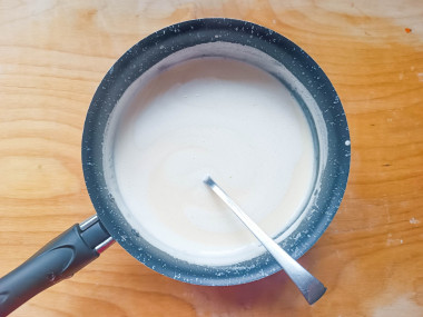 Поставьте его на небольшой огонь и, при постоянном помешивании, проварите до первых пузырей. Как только они появятся — сразу снимайте сотейник с огня.