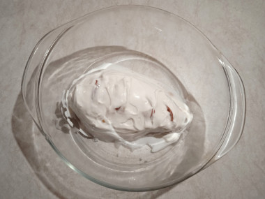 Смажьте приготовленной смесью верх грудок. Так он не подсохнет в процессе запекания, и курочка будет сочной.