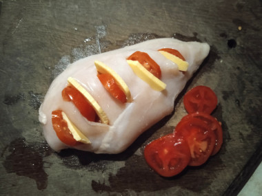 В прорези положите ломтики сыра. Старайтесь, чтобы они не выглядывали наружу, так расплавленный сыр останется внутри грудки и не вытечет.