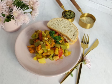 Пора подумать о новогоднем торжестве и желании влезть в любимое платье. Поэтому моими рецептами - любимчиками стали блюда из овощей. Мой выбор пал на овощное рагу с фасолью стручковой. Фасоль я выращиваю сама и замораживаю на зиму. К сожалению, сельдерей я не нашла в наших магазинах, поэтому думаю, ничего страшного не произойдет, если блюдо я приготовлю без одного ингредиента. Рецепт достаточно простой. Правда меня изначально очень смутило, что автор в описании не упомянул о воде. Но в действительности, овощи благополучно приготовились. Надеюсь утром увидеть заветное -500 грамм.