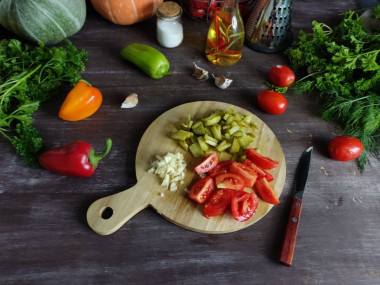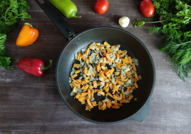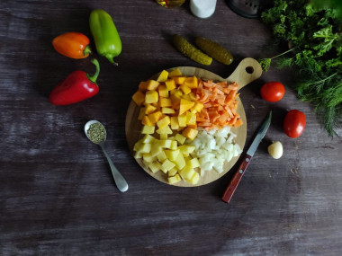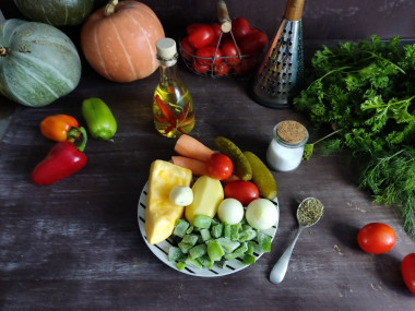 Разогрейте на сковороде растительное масло. С выбором сковороды и масла вам помогут статьи в конце рецепта. Все овощи нарежьте примерно одинаковыми кусочками и выложите в сковороду в следующем порядке: сначала лук, потом морковь, картофель, тыкву и сельдерей, последней заложите стручки фасоли. Я использовала замороженную фасоль и тыкву. Все обжарьте до полуготовности на небольшом огне, помешивая.